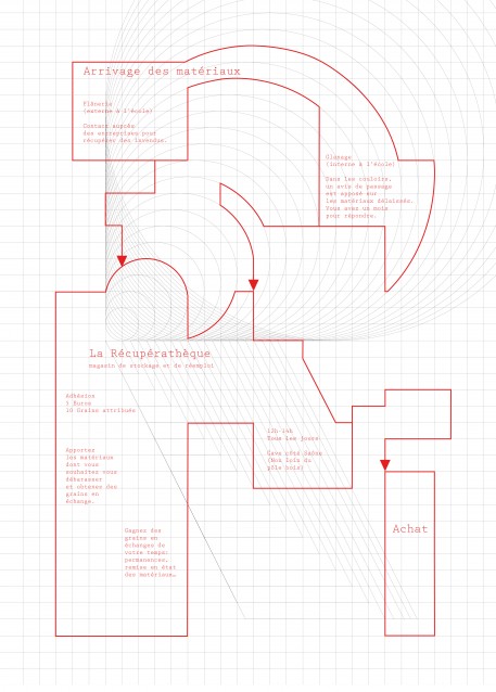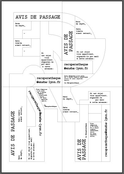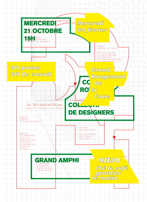 Réalisé par Marion Cachon et Thomas Baudouin en 2016.  Toute l’identité se base sur une grille elle-même basée sur le R de la Récupérathèque. Pouvant accueillir de nombreux types de contenus, la grille s’adapte et se transforme en affiche évolutive par strates, logo, avis de passage, fiche pratique, etc.